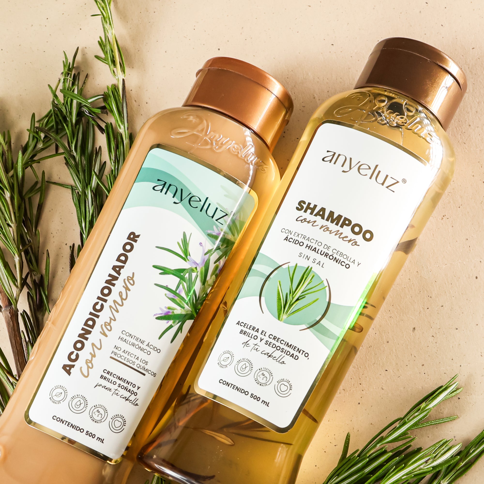 Acondicionador con Romero Anyeluz® con ácido hialurónico y extractos naturales. Cabello suave, brillante y saludable, fácil de peinar y lleno de vitalidad.